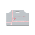 持ち手用の穴があいたポリ袋です。レジ袋よりも厚みがあって、しっかりしています。底マチが広いので、ケーキ箱や食パンを入れるのに適しています。両面印刷(半透明素材に白色印刷)です。
