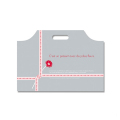 持ち手用の穴があいたポリ袋です。レジ袋よりも厚みがあって、しっかりしています。底マチが広いので、ケーキ箱や食パンを入れるのに適しています。両面印刷(半透明素材に白色印刷)です。